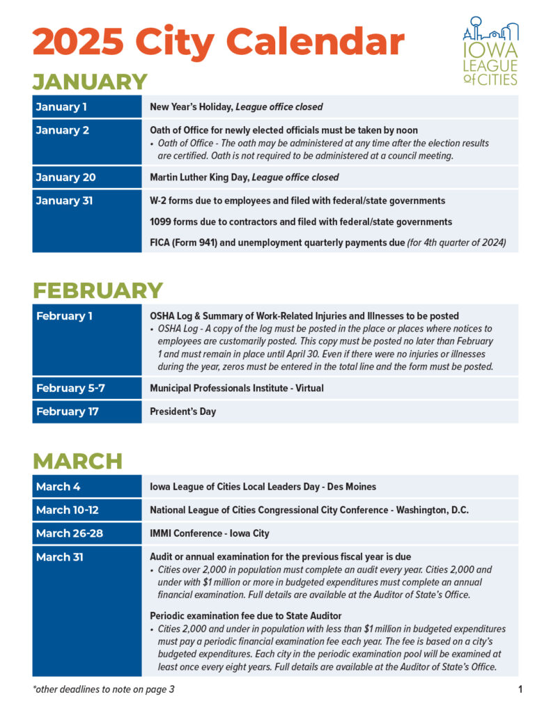 Keeping track of the due dates, reports and filings can be a lot. The League has put together the 2025 City Calendar, which details important deadlines for reports and filings that cities must complete throughout the year.